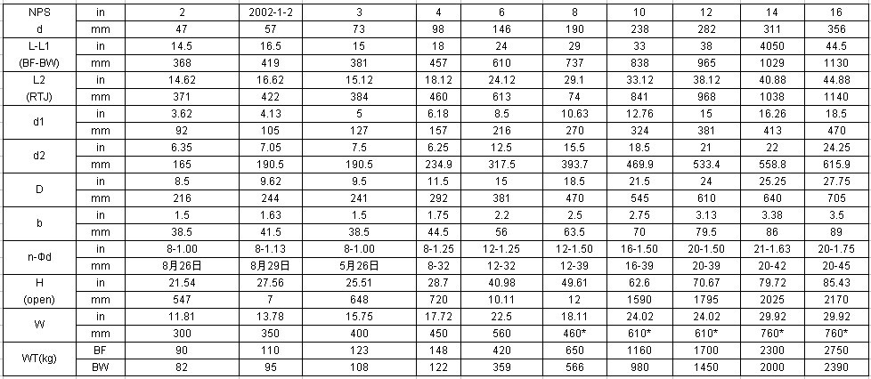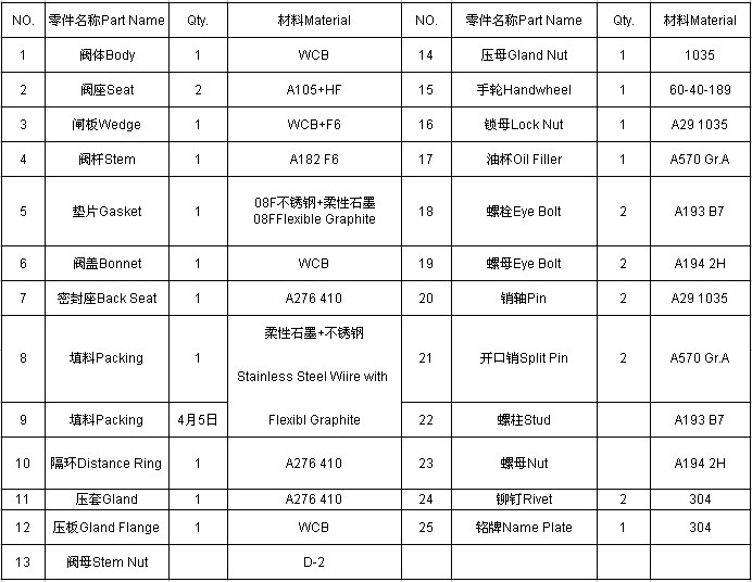 应用规范 Applocation 结构长度Face To Dimensions:ANSIB16.10 法兰尺寸End Flange Dimensions:ANSIB16.5 设计标准Basic Design:API600 检验标准Test Standard:API598 主要零件及材质Main parts and materials ![]() 主要连接尺寸及重量Main connection dimensions and weights ![]()