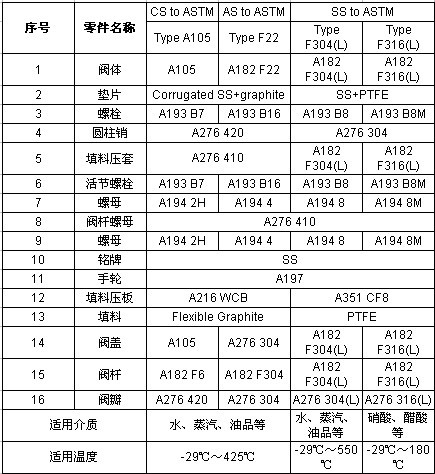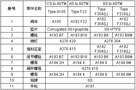 产品简介: 法兰锻钢截止阀标准材质明细表 注意:客户需求的其他材质也可采用。密封面料配对由客户指定内件代号决定。 CS=碳钢;AS=合金钢;SS=不锈钢;