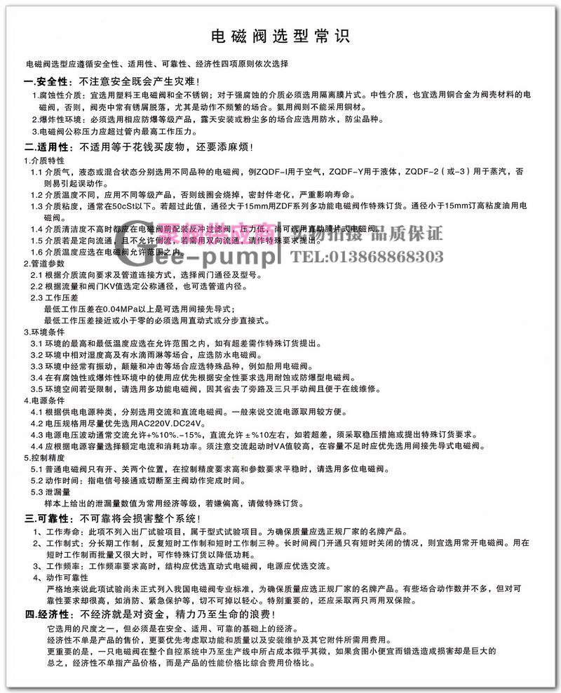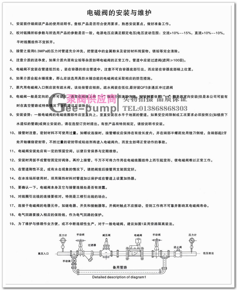 7、工作时,要注意阀门前后压力表,要求工作压力不得超过额定压力,工作压差必须在额定压差范围内。当工作压力超过额定压力或工作压差超过额定压差时,电磁阀要停止使用,关闭前后手动阀,以防止电磁阀爆 炸和泄漏。