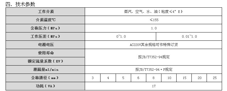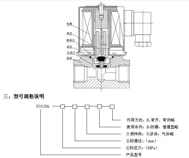 二:结构说明一、用途 JO11SA电磁阀是自动控制系统中常见的管路开关元件,被广泛运用于石油、化工、冶金、纺织、食品、造船、医疗、环保及其他各工业部门的管路装置中,完成系统中气体、水蒸气、液体、油类(≤4°E)等介质自动控制,实现节能和程序控制的自动化。 ![]() ![]() ![]() 七、使用保养 1、建议使用单位指派专人负责使用保养。 2、电磁阀安装后,须通入介质试动作数次,确认正常后方可投入正式使用。 3、应定期清洗大阀内外及衔铁吸合面的污物。注意不要损坏密封面。 4、电磁阀较长时间不用时,应关闭阀前手动阀,重新启用时,蒸汽电磁阀应将冷凝水排除干净,并作试动作数次,待开关正常后方可投入使用。 5、电磁阀从管路上卸下不用时,应将内部零件试净并用压缩空气吹净储存。 6、使用时间较长时,如活塞与阀座间密封不好,可将活塞密封面重新磨平,再和阀座研磨。 7、工作时,要注意阀门前后压力表,要求工作压力不得超过额定压力,工作压差必须在额定压差范围内。当工作压力超过额定压力或工作压差超过额定压差时,电磁阀要停止使用,关闭前后手动阀,以防止电磁阀爆 炸和泄漏。