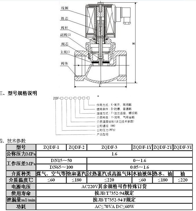 ![]() ![]() ![]() 产品简介 一、用途 ZQDF(Y)系列蒸汽(液用)电磁阀是工业过程自动化控制系统用的执行器,它在接受电控信号后能自动开启或关闭阀门,实现对管道中流体介质的通断或流量调节控制,从而对系统中的温度、流量、压力等参数进行自动调节或远程控制。 ZQDF系列蒸汽电磁阀可广泛应用于纺织、印染、化工、塑料、橡胶、制药、食品、建材、机械、电器、表面处理等生产和科研部门以及浴室、食堂、空调等人们日常生活设施中。ZQDF系列电磁阀主要用于空气、蒸汽、煤气等气体介质的控制;ZQDF-Y系列电磁阀主要用于自来水、蒸馏水、冷冻盐水、电镀废液等液体介质,同时也用于粘度小于4°E的油类。 二、结构说明 ![]() ![]() 六、、安装须知 1、安装时电磁阀线圈向上,并保持垂直位置,电磁阀上箭头或标记应与管道流向一致,不得安装在有溅水或漏水的地方。 2、电磁阀的工作介质应清洁无颗粒杂质,电磁阀内件表面上的污物及过滤器,须定期清洁干净。 3、在电磁阀发生故障时,为了及时隔离电磁阀,并保证系统正常运行,最好安装旁路装置(如图一)。注意:旁路上的阀门平时须关闭。如果电磁阀安装在支架上,电磁阀的通径应小于主管道上阀门的通径。如图(二)。 4、安装电磁阀前,管道必须清洗干净。建议在阀前安装过滤器,蒸汽管道安装疏水阀。 5、不要将阀安装在管道的低凹处,以免因蒸汽冷凝水、杂质等沉淀在阀内而防碍动作。 6、普通型不可在爆 炸危险场合使用。 7、在管道刚性不足情况下,建议把阀前后管子用支架固定,以防电磁阀工作时引起振动 8、在安装前,要注意看清产品标牌,认真阅读使用说明书,判断产品是否符合使用条件。 9、电磁阀前后管道需安装上压力表,以便观察管道压力。 七、使用保养 1、建议使用单位指派专人负责使用保养。 2、电磁阀安装后,须通入介质试动作数次,确认正常后方可投入正式使用。 3、应定期清洗大阀内外及衔铁吸合面的污物。注意不要损坏密封面。 4、电磁阀较长时间不用时,应关闭阀前手动阀,重新启用时,蒸汽电磁阀应将冷凝水排除干净,并作试动作数次,待开关正常后方可投入使用。 5、电磁阀从管路上卸下不用时,应将内部零件试净并用压缩空气吹净储存。 6、使用时间较长时,如活塞与阀座间密封不好,可将活塞密封面重新磨平,再和阀座研磨。 7、工作时,要注意阀门前后压力表,要求工作压力不得超过额定压力,工作压差必须在额定压差范围内。当工作压力超过额定压力或工作压差超过额定压差时,电磁阀要停止使用,关闭前后手动阀,以防止电磁阀爆 炸和泄漏。 ![]() |