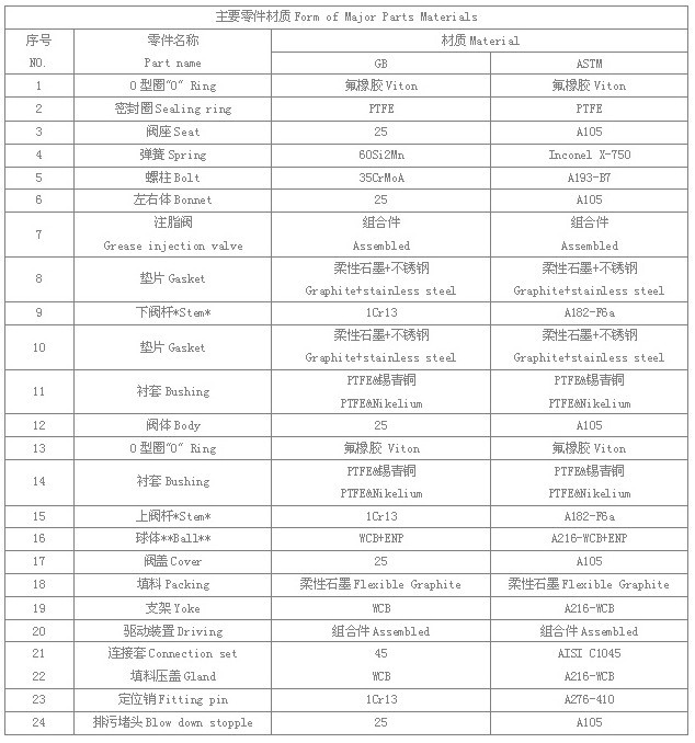Butt-weld Connection Forged Steel Trunnion Type Ball Valve Q(3 、6 、7 、8 、9)67F(N、P) ![]() 技术规范 ![]() *注:1、系列阀门连接法兰及对焊端尺寸可根据用户要求设计制造。 2、DN>1000(4011)阀门设计标准按《长输管线阀门技术条件》 *Notes:1.The sizes of serial valve connecting flange and butt- welding terminal can be designed according to customer’s requirement. 2.DN>1000(4011),,the design standard is accordance with 《Specification of the length pipe valve》 主要零件材质 ![]() 注:*抗硫型阀门该零件的材质为GB(1Cr18Ni9)、ASTM(A276-321) **抗硫型阀门该零件的材质为GB(1Cr18Ni9、CF8+Ni.P)、ASTM(A182-304、CF8+Ni.P) 系列阀门主要零部件及密封的材质可根据实际工况条件或用户特殊的要求设计选用。 Notes:*The material of this part about the anti-sulphur type valve is GB(1Cr18Ni9)、ASTM(A276-321) **The material of this part about the anti-sulphur type valve is GB(1Cr18Ni9、CF8+Ni.P)、ASTM(A182-304、CF8+Ni.P) Major parts of the valve series and materials of sealing surface siffer according to actual working condition and customer’s special requirement. |