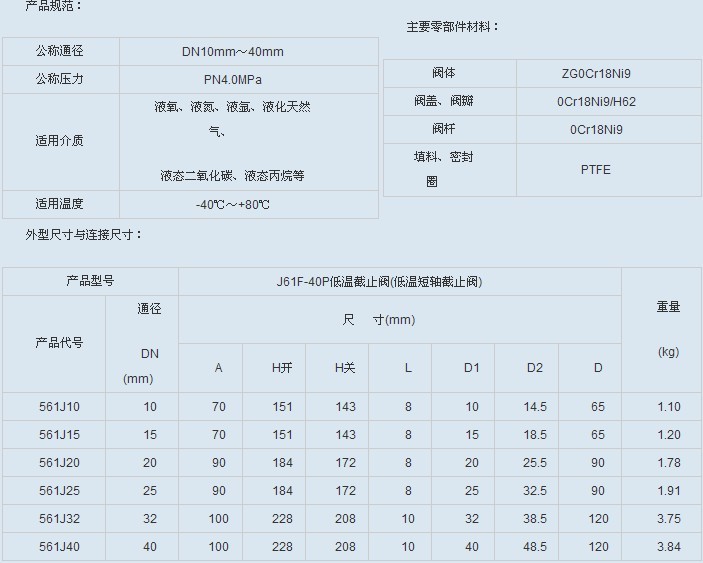 J61F-40P 低温截止阀