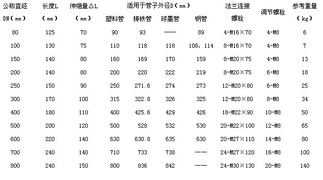 承盘伸缩管,该产品一端为法兰,另一端为承口,与传统伸缩器相比,该产品重量轻,性能优,结构新颖,安装简单方便,密封效果好,并且密封强度可根据需要自如调节。
