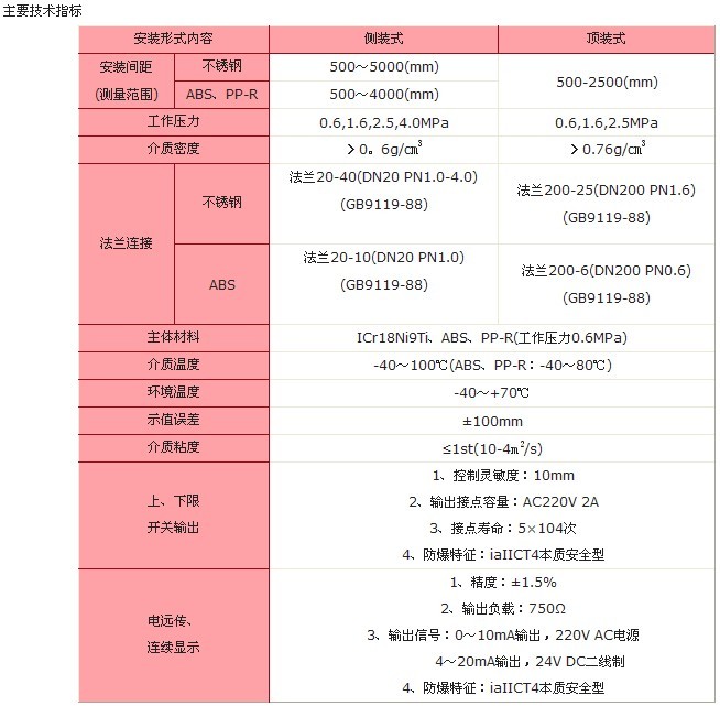 侧装式磁翻板液位计用于低温到高温,真空到高压等各种环境,是石油、化工等工业部门的理想液位测量产品。根据在容器中安装位置的不同,提供侧装和顶装两种形式。根据工作介质不同,提供不锈钢和ABS、PP-R工程塑料三种材质,其中ABS、PP-R材质适用于酸、碱等腐蚀性介质。